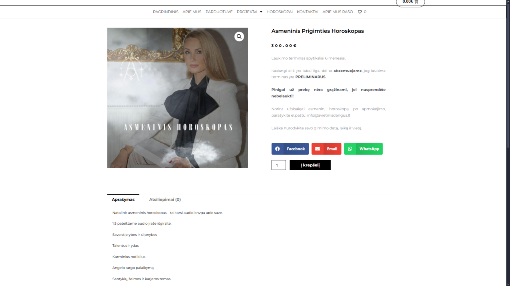 Astrologijos ir meditacijos platforma. Jau daugiau nei metus bendradarbiaujame su šiuo projektu – prižiūrime svetainę, darome dizaino pakeitimus, diegiame naujas funkcijas bei automatizuojame skaitmeninių prekių pardavimus.